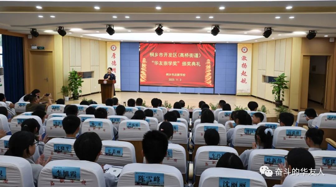 錦繡年華,友你同行;崇智尚德,學而致遠。近日,2023年桐鄉(xiāng)經(jīng)濟開發(fā)區(qū)(高橋街道)“華友崇學獎”頒獎典禮在啟新學校報告廳舉行。